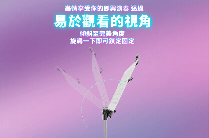旋轉解鎖上方支架,調整至理想視覺的傾斜角度。最多可向後傾斜30°,帶來舒適的閱譜體驗。