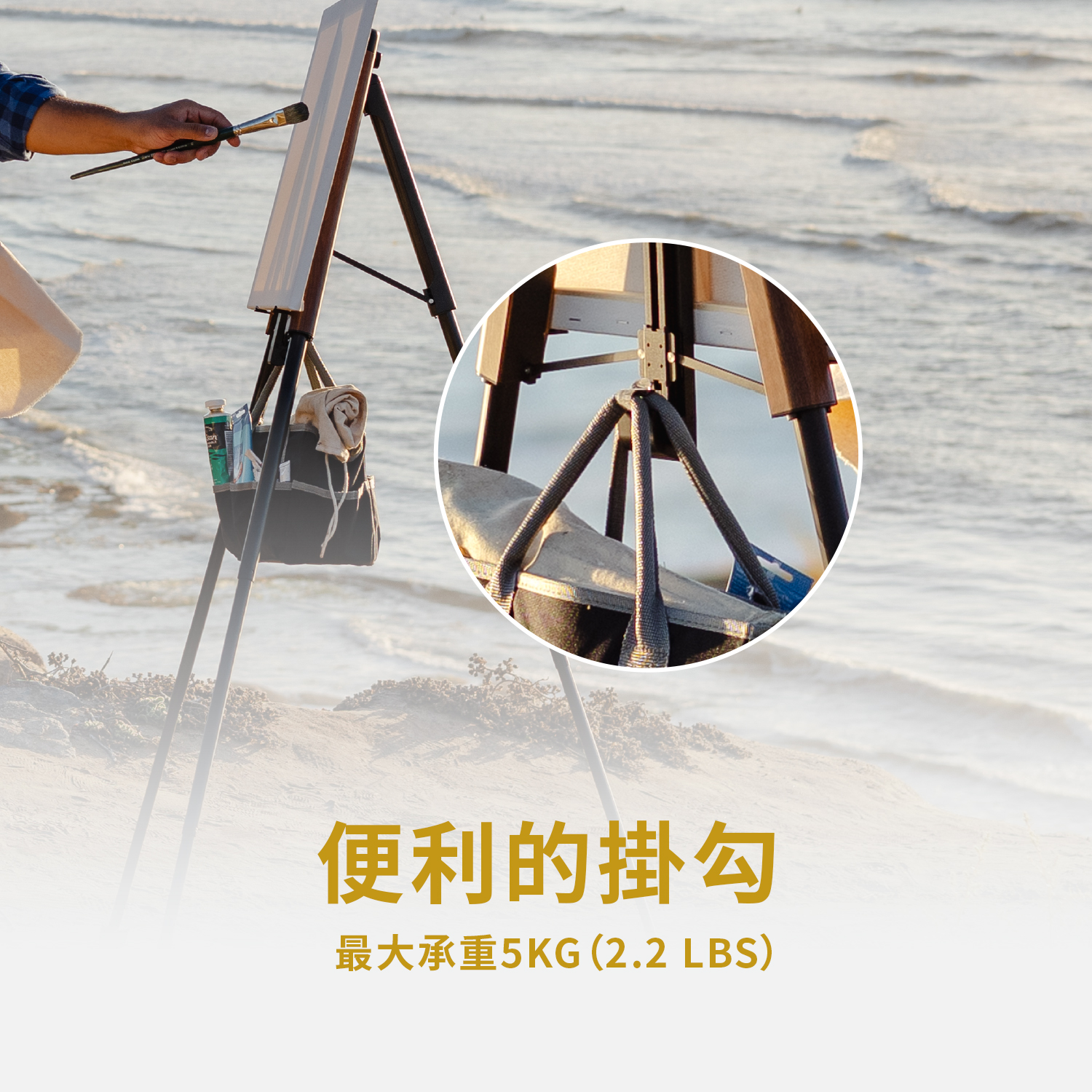 採用陽極處理鋁合金三腳架結構打造,畫架可承重高達5公斤(11 "),同時可懸掛畫具袋或顏料桶,方便操作並提升穩定性。