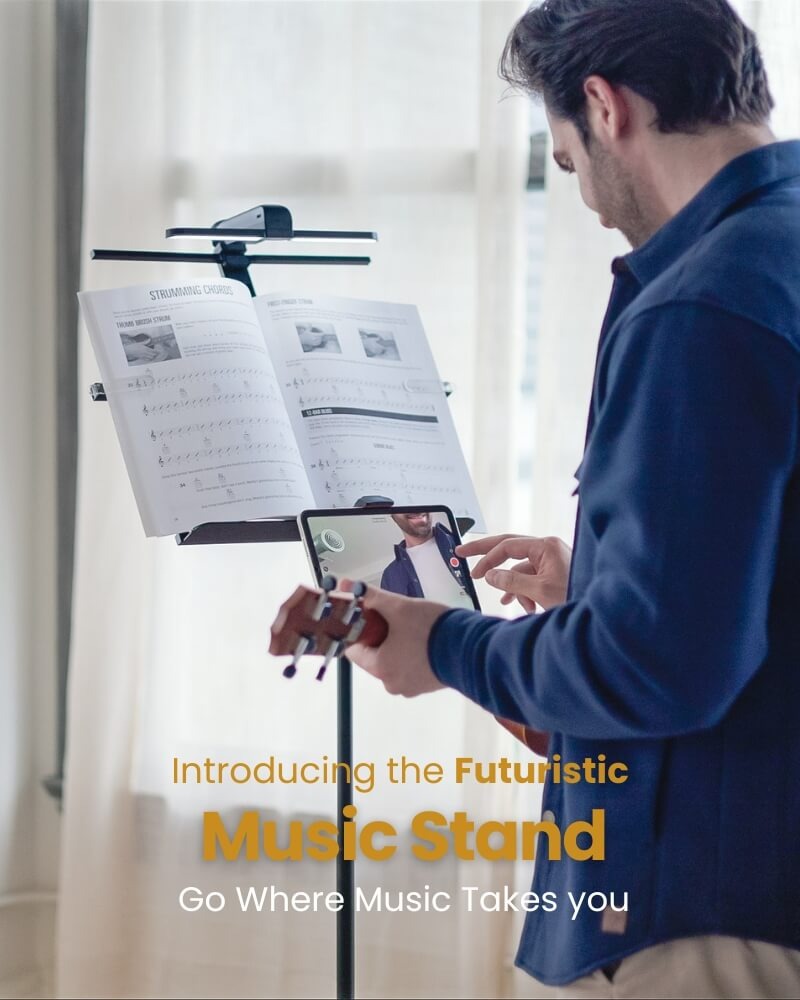- 符合人體工學的視角與可伸縮托架: 置譜托架最多可傾斜 30 度,以便舒適觀看,可容納 A4 至 A3 尺寸樂譜,並配置固定夾防止滑動。