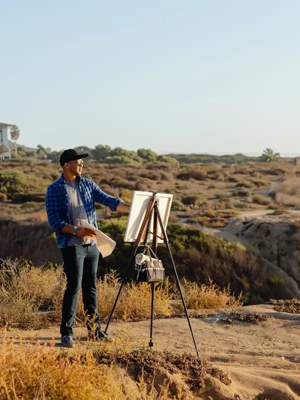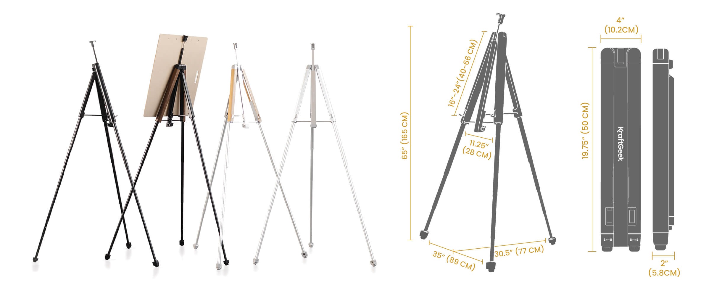 - 輕巧便攜: 可調整式畫架採用輕量鋁合金製成,折疊後僅 50 公分(19.8"),重量僅1.75 公斤(3.85 lbs),方便收納與攜帶,是戶外繪畫、風景畫或有限工作空間的理想選擇。