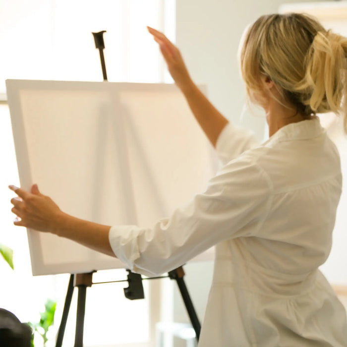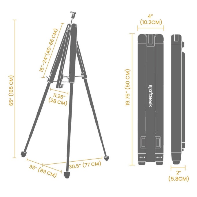 最高可達165公分(65")(從地面到上方夾具頂端),無論您喜歡站立作畫還是舒適地坐著,伸縮鋁合金畫架都能輕鬆適應您的需求。同時,支架可鎖定在不同的高度,以便在不平坦的表面或調整畫布角度時保持平衡。