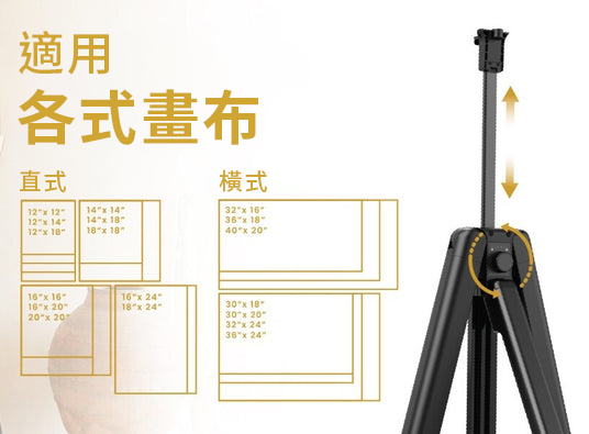 - 畫布相容性高: 可調整式畫架設置有可伸縮彈簧支架,適用於各種畫布,寬度大於28.5公分(11.25")、高度低於65公分(26")、厚度最大為 3.8公分(1.5")的畫布,非常適合畫廊和戶外展示。