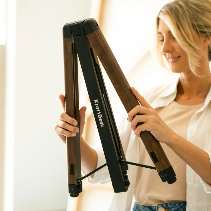 - 強化穩固性: 便攜式畫架每支腳架都配有安全的旋轉鎖定裝置和防滑矽膠墊,可支撐高達5 公斤(11 lbs)的重量,即使在不平地面也能穩定支撐畫布。